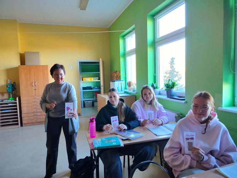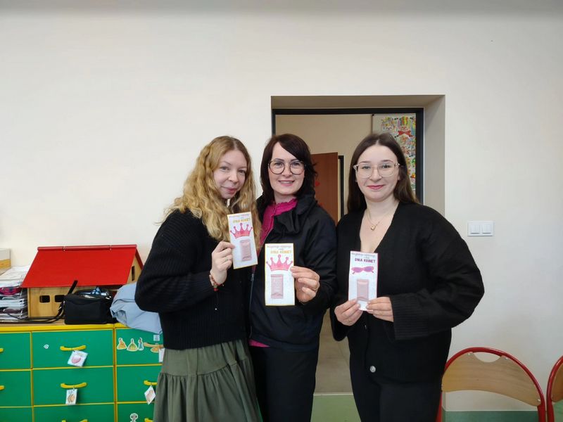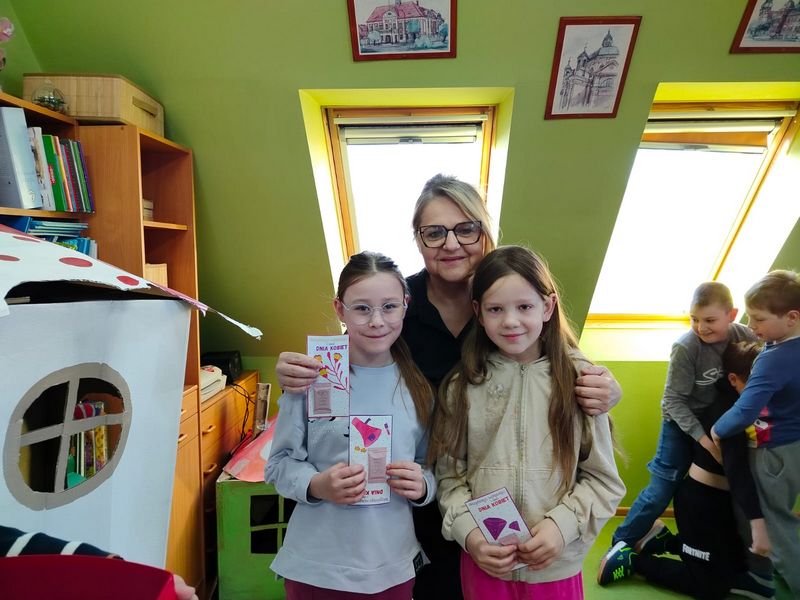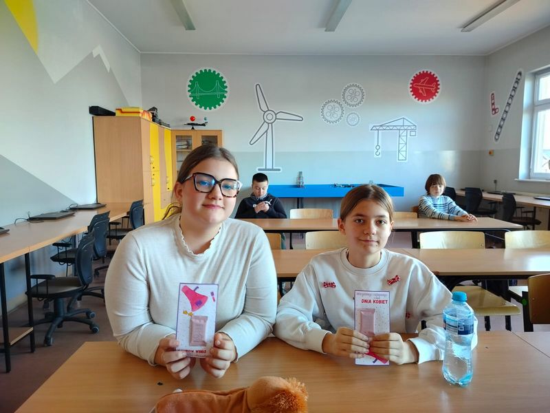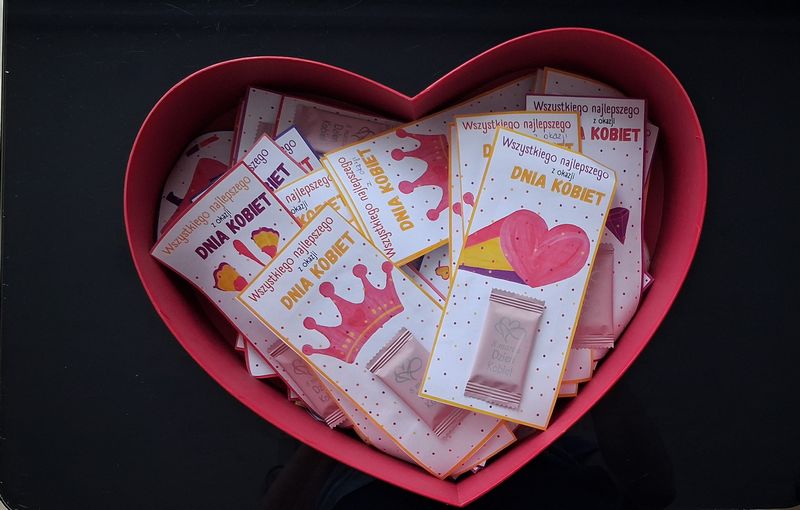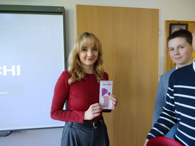 Każda kobieta i dziewczyna w naszej szkole otrzymała życzenia oraz słodką czekoladkę. Był to drobny gest, który miał wyrazić wdzięczność, szacunek oraz sympatię dla wszystkich kobiet tworzących naszą szkolną społeczność.