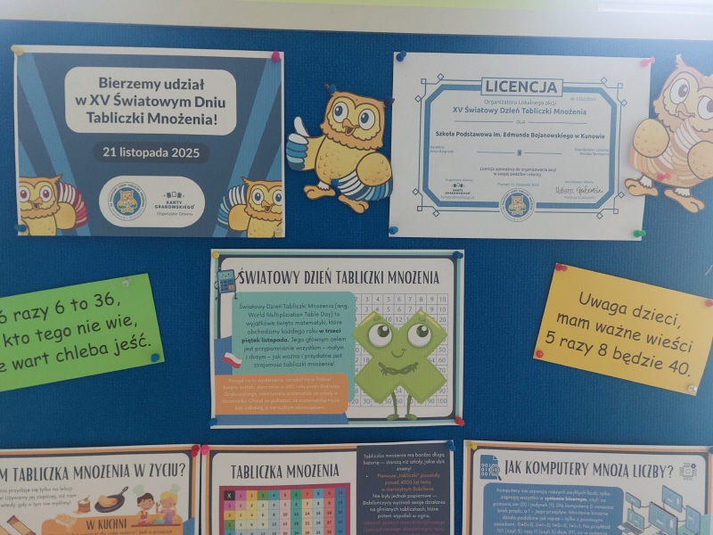 Za nami XV Światowy Dzień Tabliczki Mnożenia. Od września uczniowie doskonalili umiejętność mnożenia na lekcjach matematyki, a uroczysty finał miał miejsce 21 listopada. Pierwszoklasiści i drugoklasiści świętowali w swoich salach, natomiast uczniowie klas III–VII uczestniczyli w ruchowych zabawach z tabliczką mnożenia. Na szkolnym korytarzu pojawiły się także logiczne gry z kodami QR. Dziękuję wszystkim za wspólną zabawę!