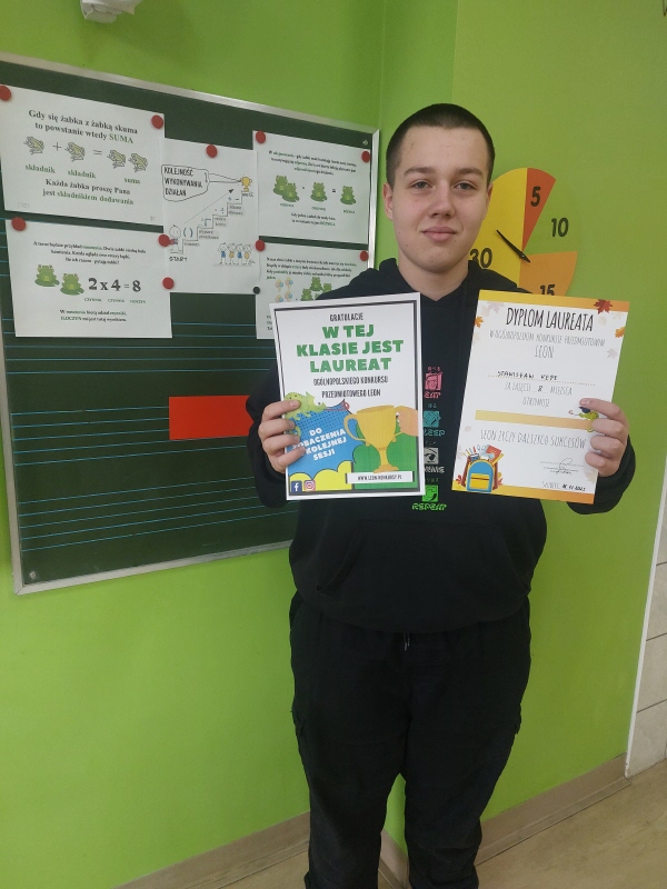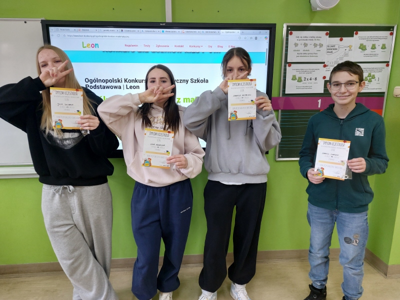 W listopadzie uczniowie naszej szkoły ponownie wzięli udział w Ogólnopolskim Konkursie Matematycznym „LEON”. Wśród licznych uczestników czworo zdobyło tytuł laureata: Stanisław Kepe z klasy 8, Paweł Skowroński z klasy 6, Michał Idaś z klasy 3 oraz Szymon Jeziorski z klasy 2. Gratulujemy wszystkim uczestnikom i zapraszamy do zapisów na sesję wiosenną, które trwają do 4 marca.