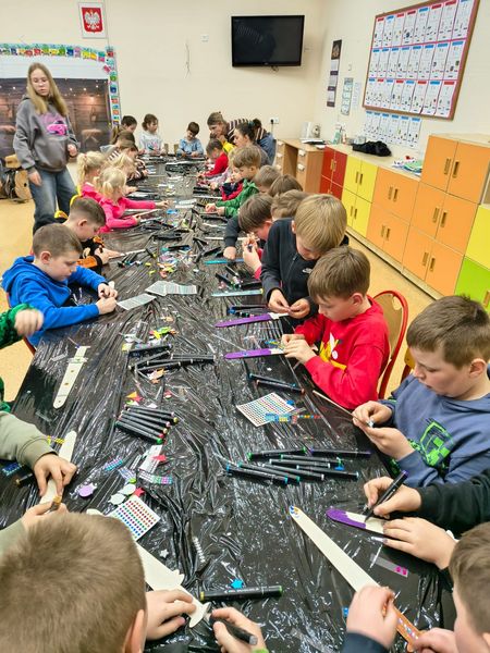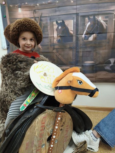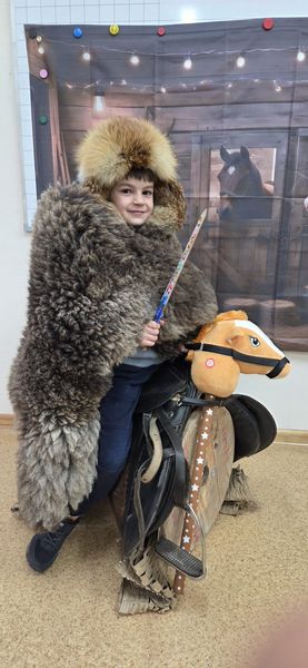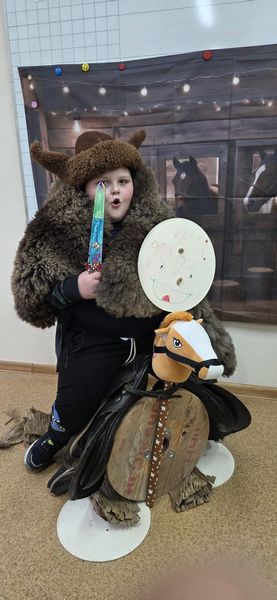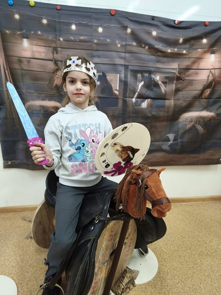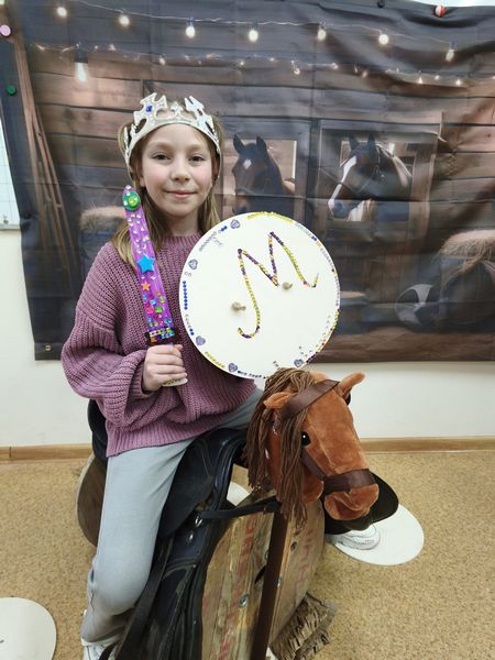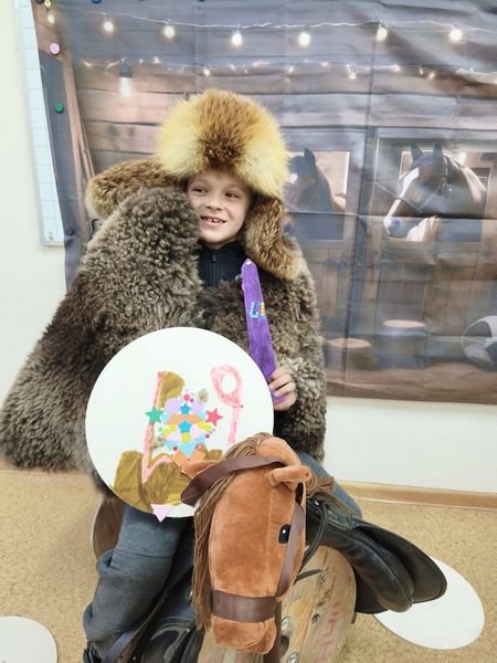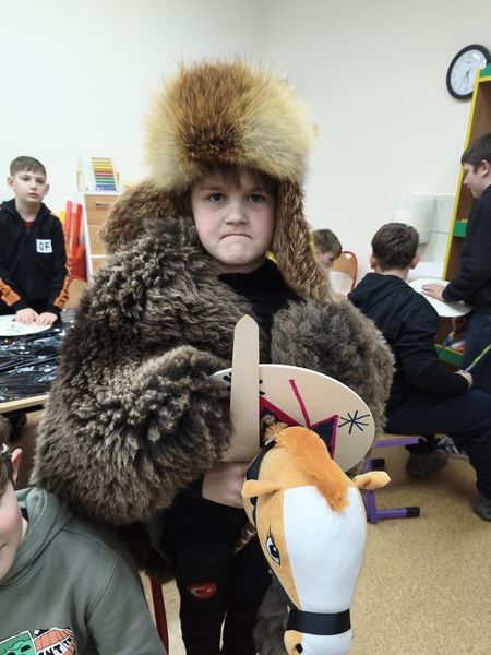 Następnie dzieci z ogromnym zaangażowaniem stworzyły własne repliki mieczy i tarcz, wykazując się przy tym kreatywnością i dużą precyzją. Każdy mógł poczuć się jak prawdziwy woj – tym bardziej, że była też okazja „dosiąść konia” w pełnym rynsztunku (czyli właśnie uzbrojeniu, płaszczu z barana, czapki z lisa itp.), co wywołało mnóstwo radości i śmiechu.