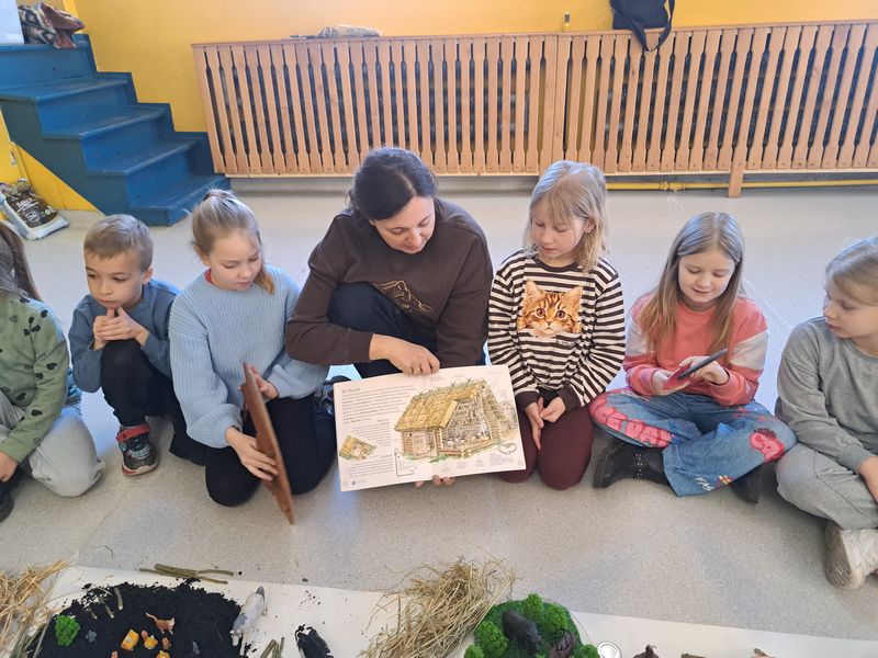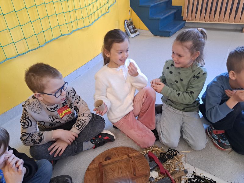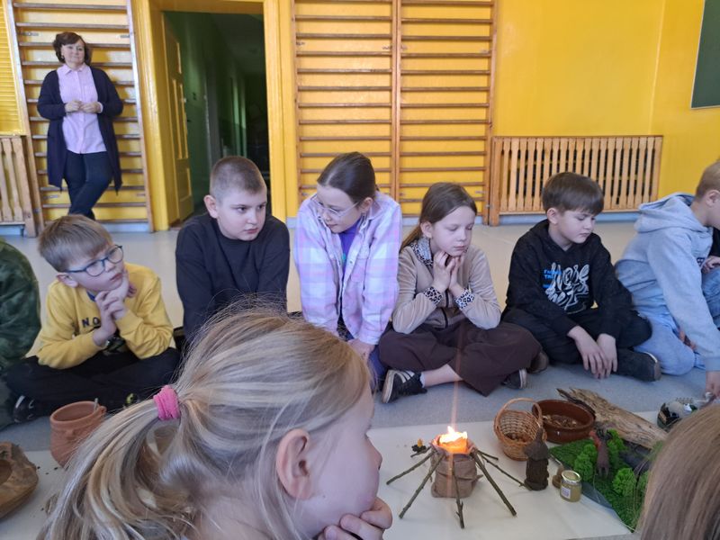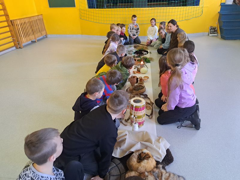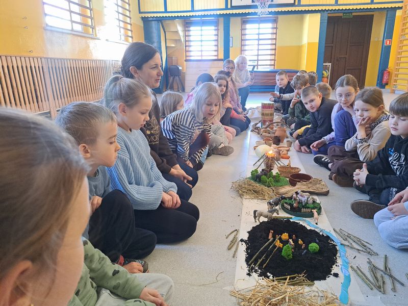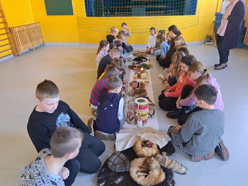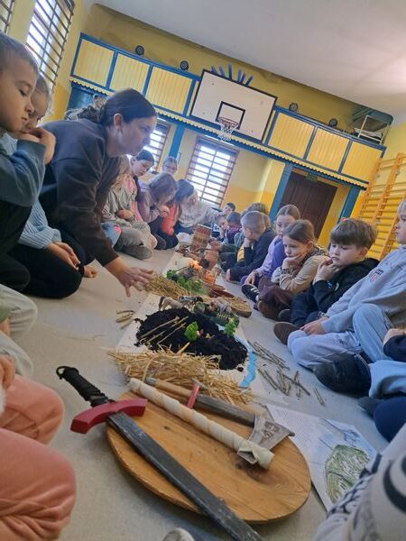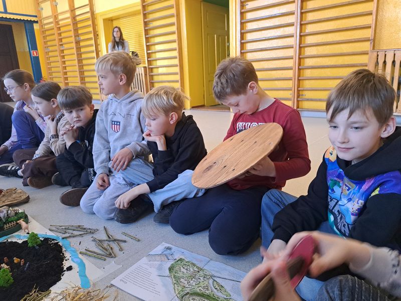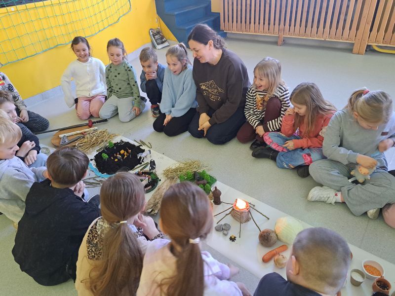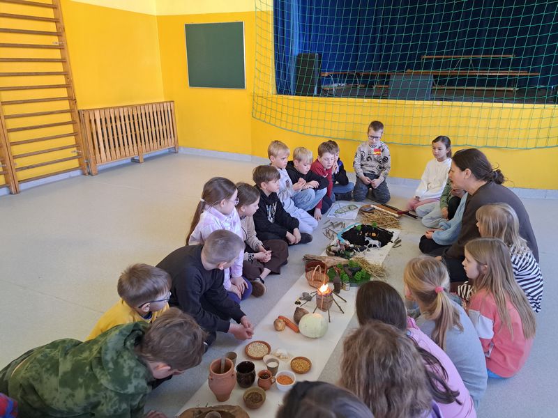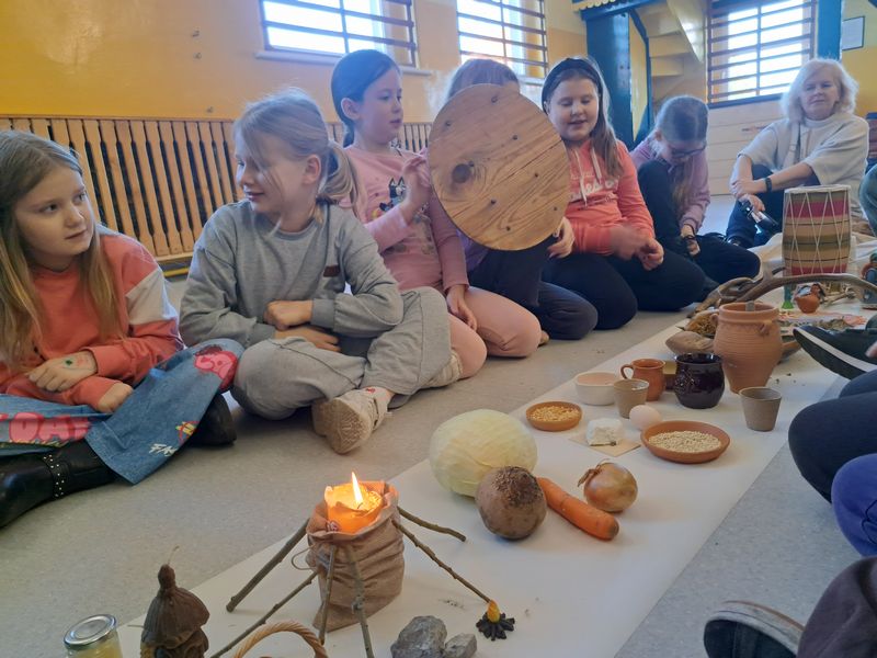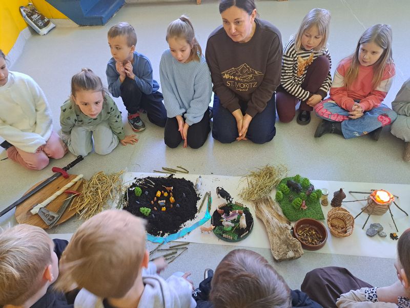 Zajęcia rozpoczęliśmy od opowieści przy symbolicznym „ognisku”. Dzieci siedząc w kręgu przeniosły się wyobraźnią do czasów, gdy nie było telefonów, samochodów ani sklepów. Rozmawialiśmy o tym, jak żyli dawni Słowianie – gdzie mieszkali, jak zdobywali jedzenie, czym się zajmowali i jak ważna była dla nich przyroda.
