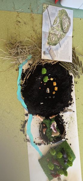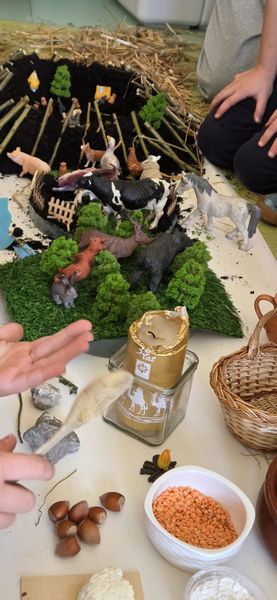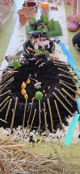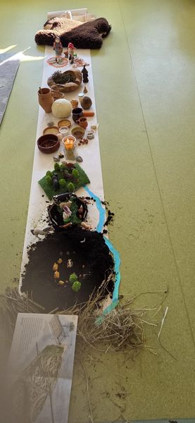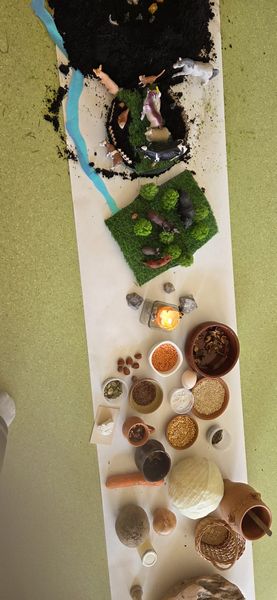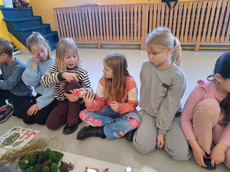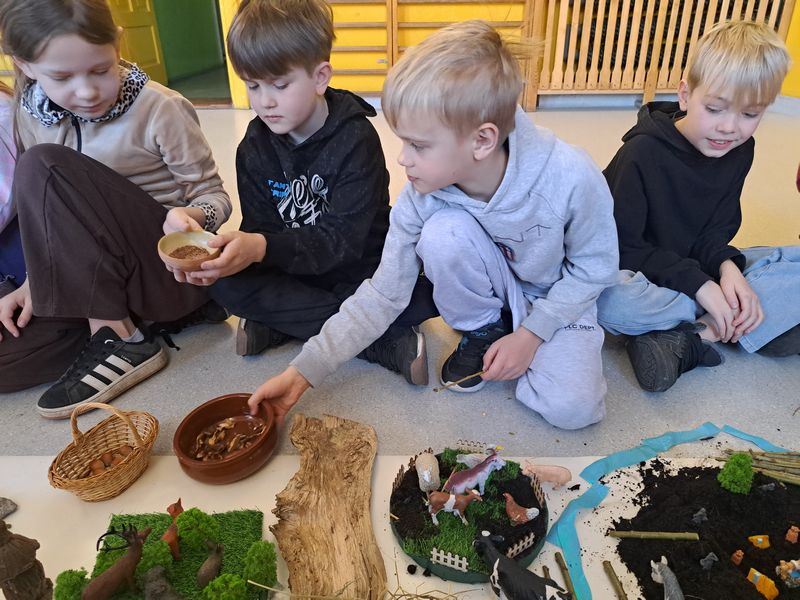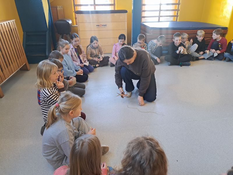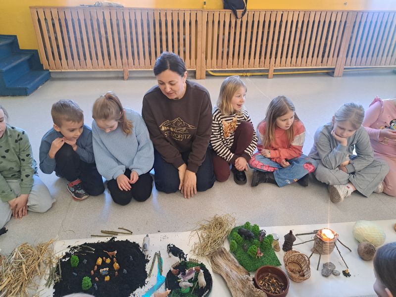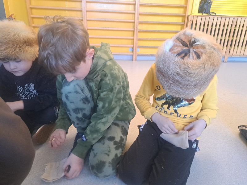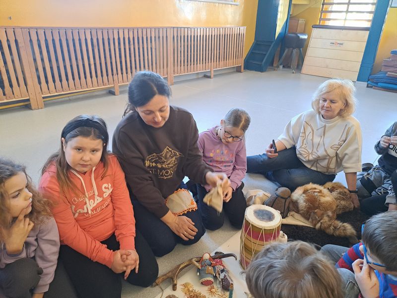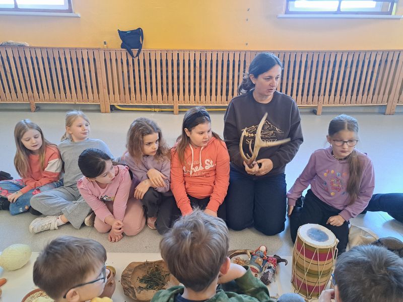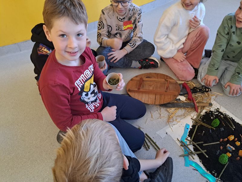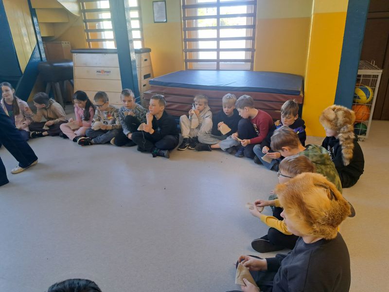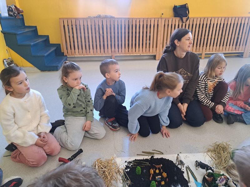 Zajęcia rozpoczęliśmy od opowieści przy symbolicznym „ognisku”. Dzieci siedząc w kręgu przeniosły się wyobraźnią do czasów, gdy nie było telefonów, samochodów ani sklepów. Rozmawialiśmy o tym, jak żyli dawni Słowianie – gdzie mieszkali, jak zdobywali jedzenie, czym się zajmowali i jak ważna była dla nich przyroda.