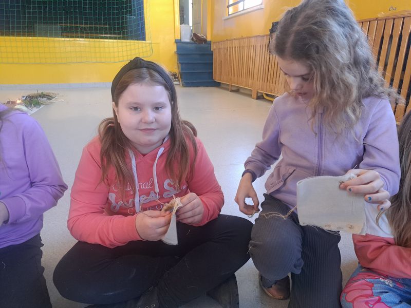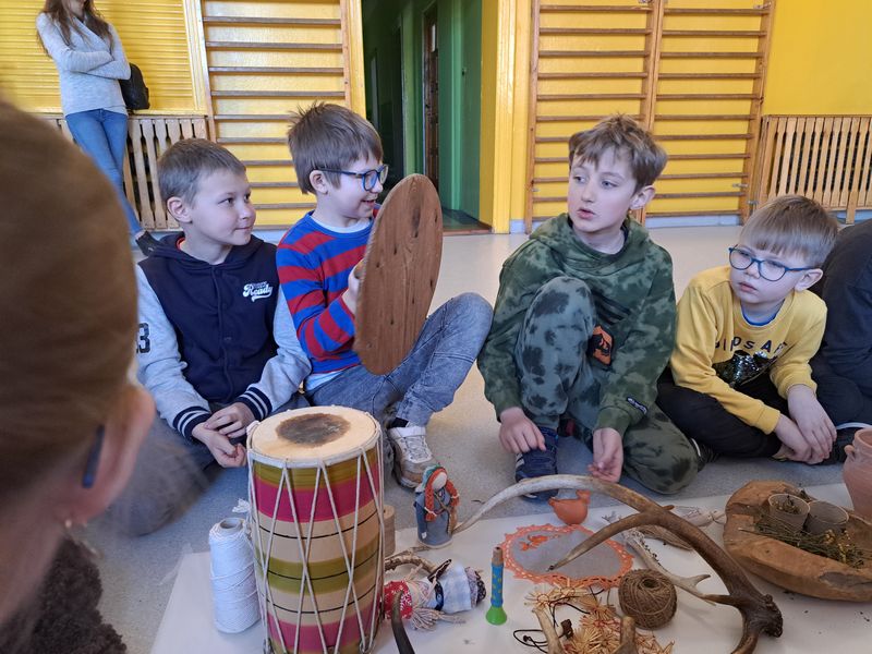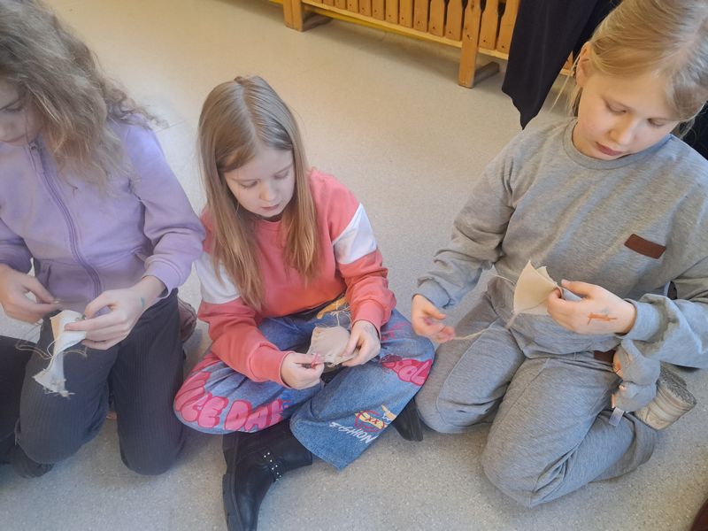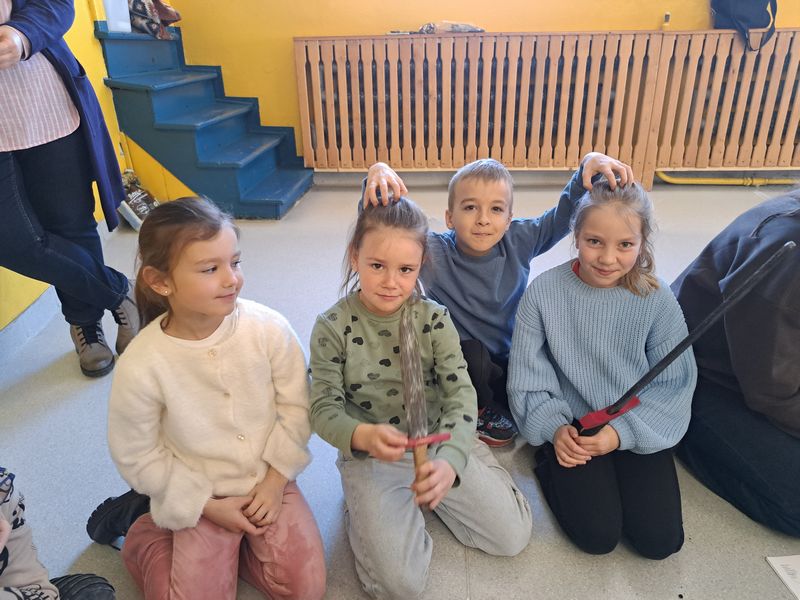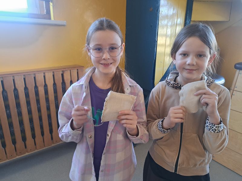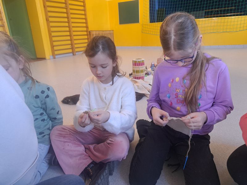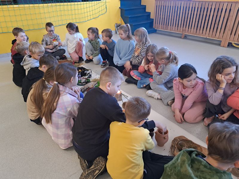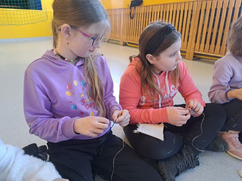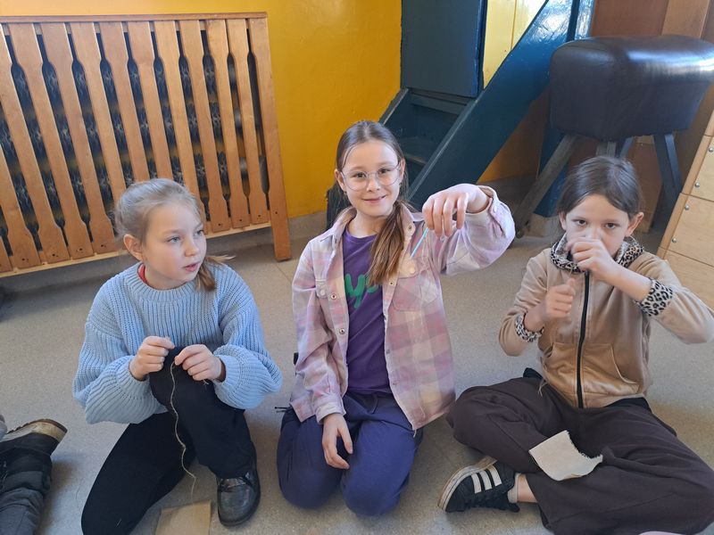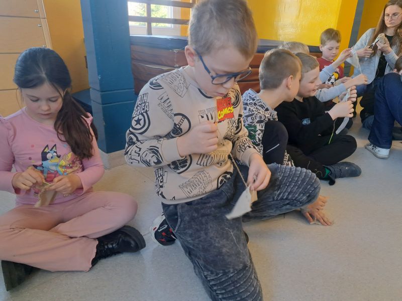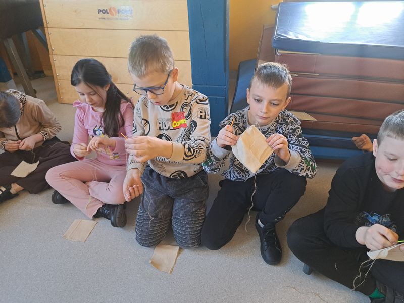 Na zakończenie zajęć najmłodsi lepili z gliny, a uczniowie klas 1–3 uszyli własne lniane woreczki – sakiewki. Było to ciekawe i bardzo angażujące spotkanie, które pozwoliło dzieciom choć na chwilę poczuć klimat dawnych czasów.
