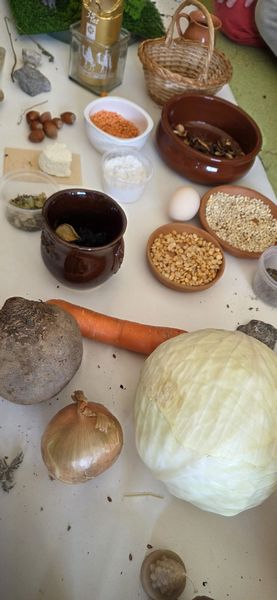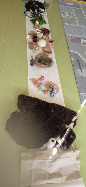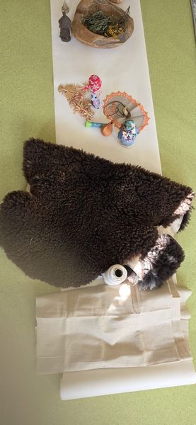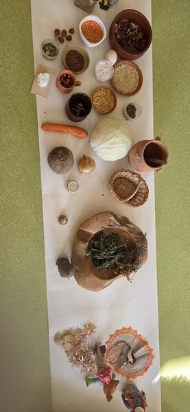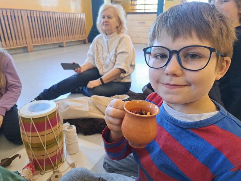 Dzieci mogły także zobaczyć i dotknąć przedmiotów inspirowanych dawną codziennością – m.in. lnianej tkaniny, skóry baraniej, drewnianej łyżki, glinianych naczyń oraz dawnych zabawek, takich jak lalki motanki, piszczałki i gwizdki.