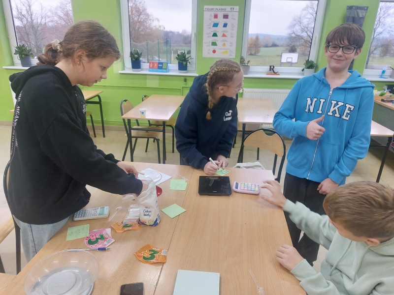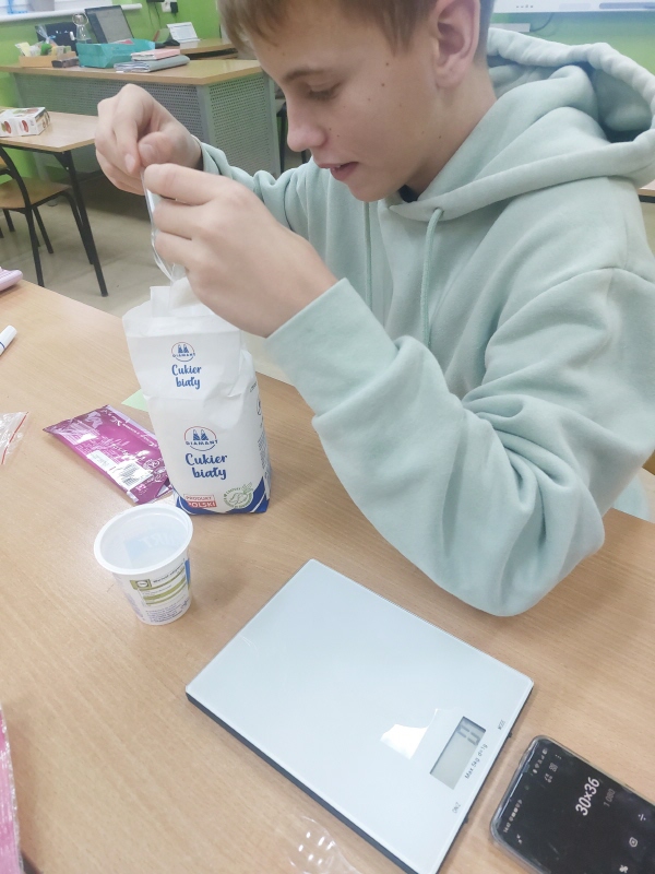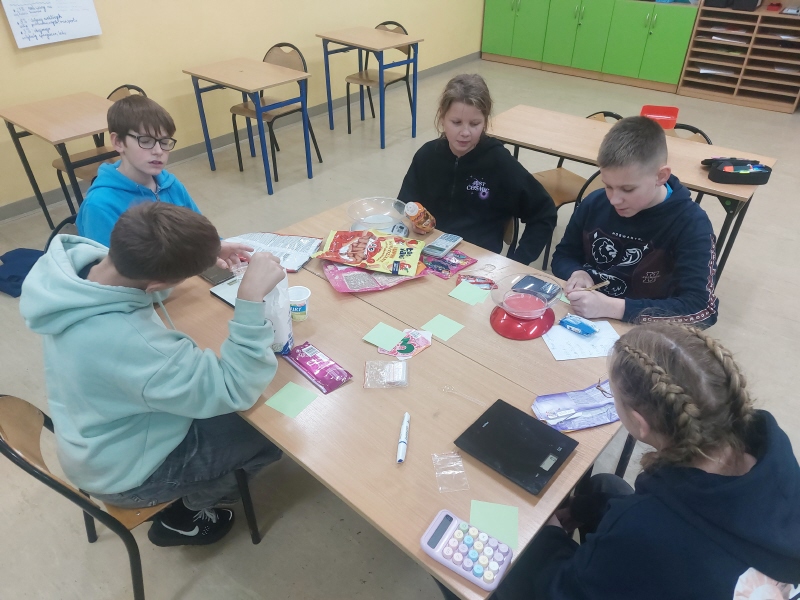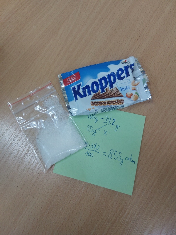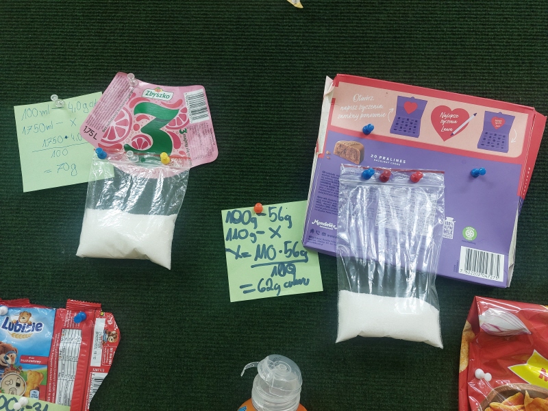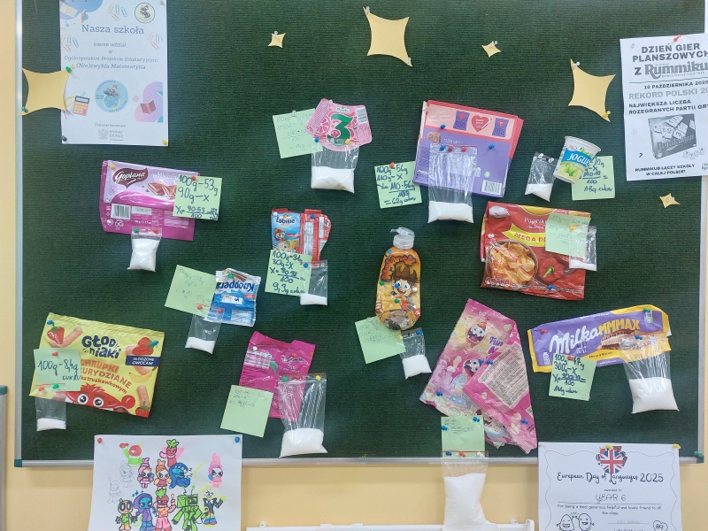 W listopadzie zainteresowani uczniowie spotkali się po lekcjach, aby przygotować tablicę przedstawiającą ilość cukru w ulubionych przekąskach i napojach. W ten sposób zrealizowali zadanie 6 z modułu IV projektu „Wiem, co jem”. Podczas pracy uczniowie utrwalili i przypomnieli sobie jednostki masy.
