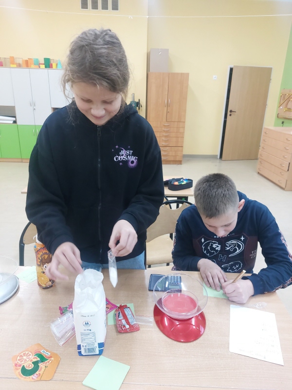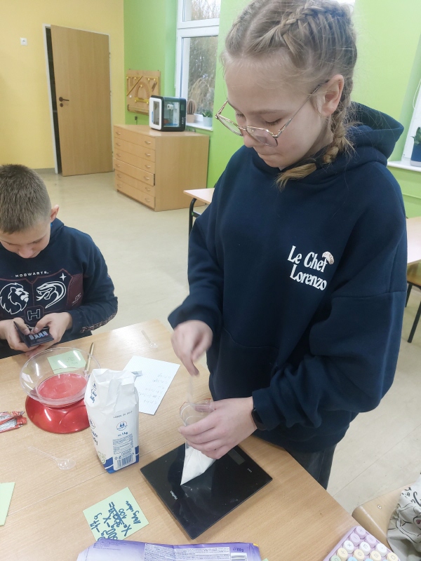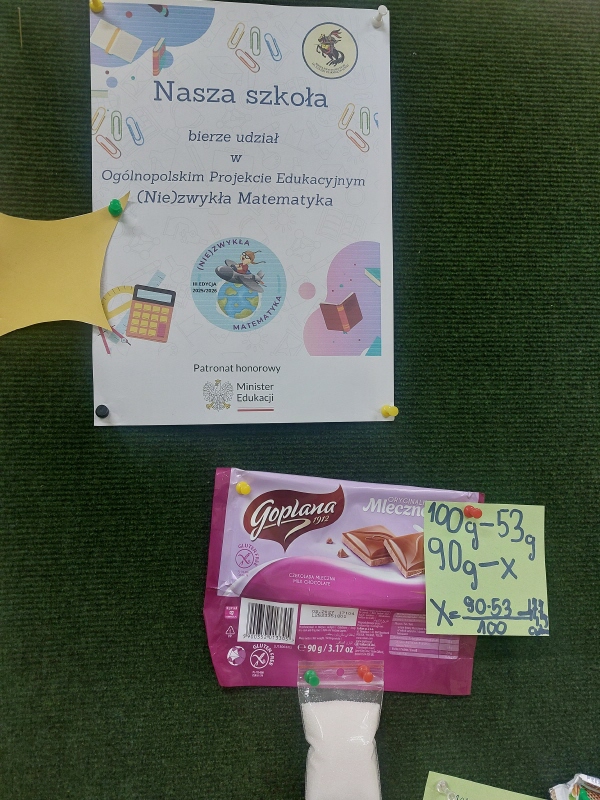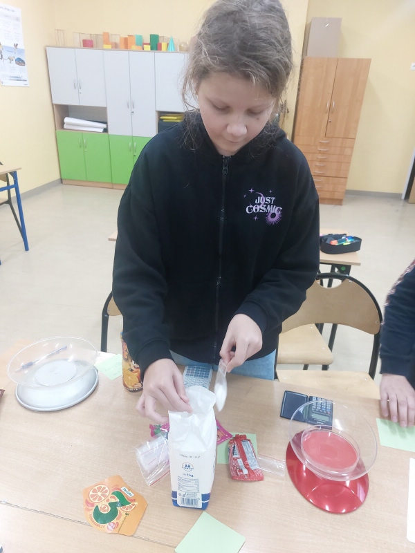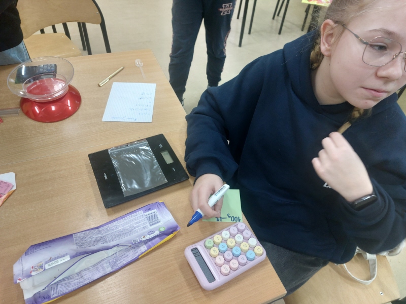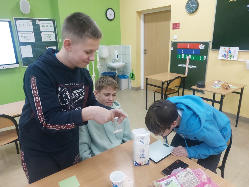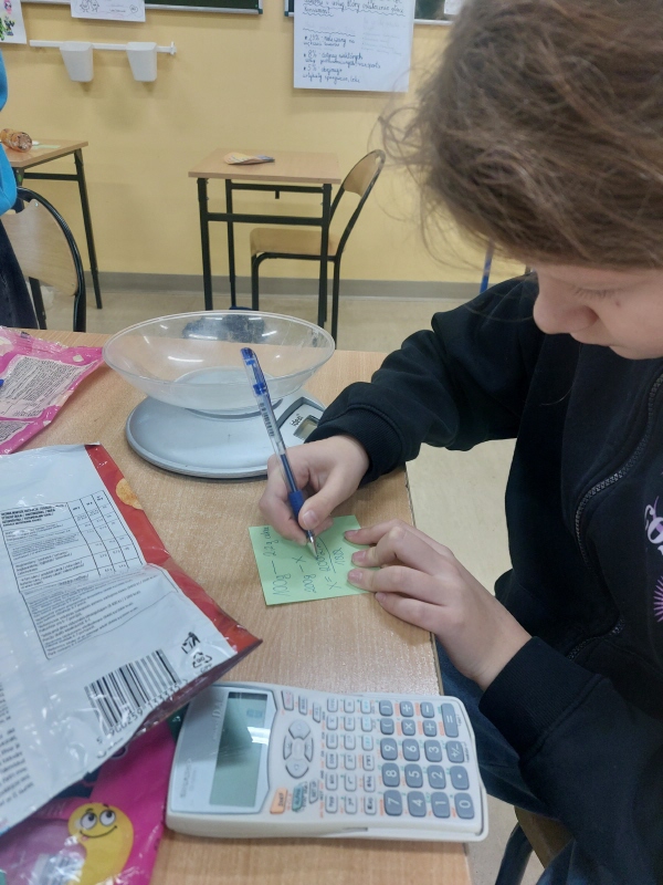 W listopadzie zainteresowani uczniowie spotkali się po lekcjach, aby przygotować tablicę przedstawiającą ilość cukru w ulubionych przekąskach i napojach. W ten sposób zrealizowali zadanie 6 z modułu IV projektu „Wiem, co jem”. Podczas pracy uczniowie utrwalili i przypomnieli sobie jednostki masy.