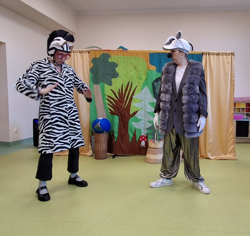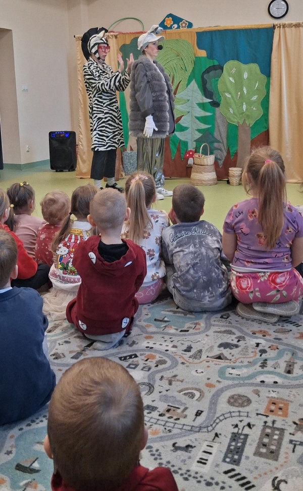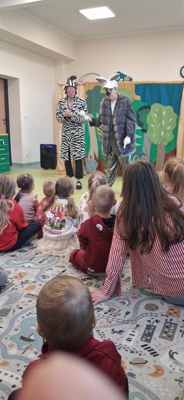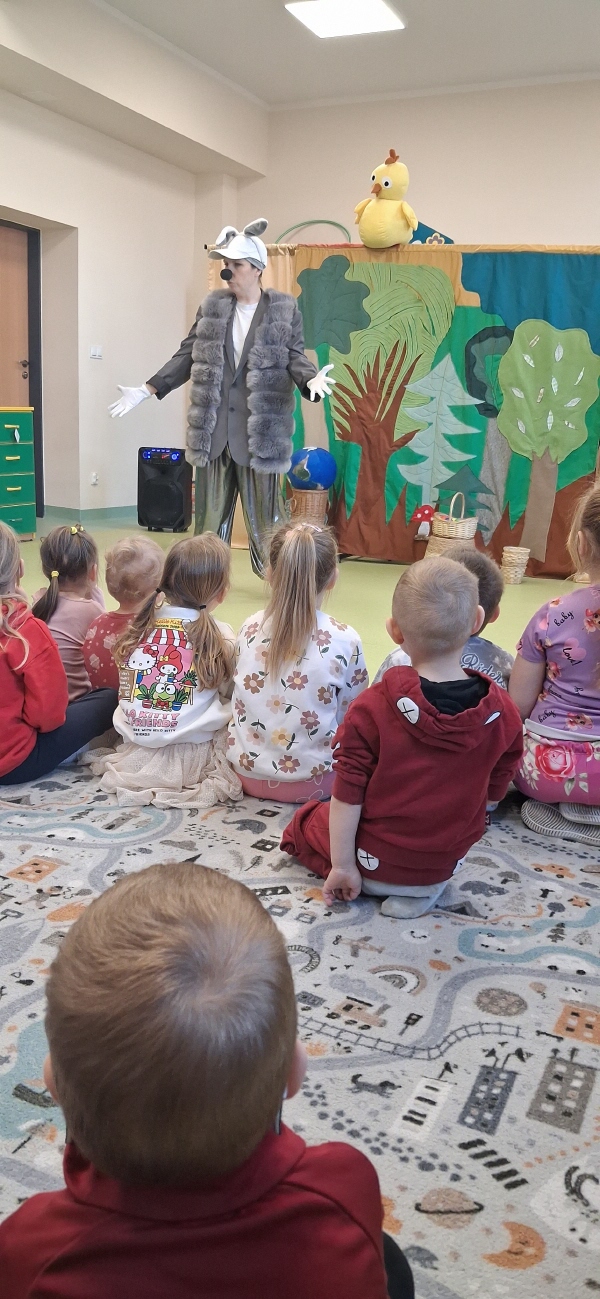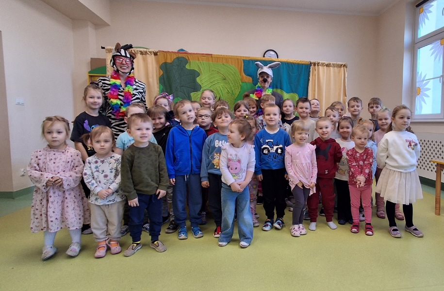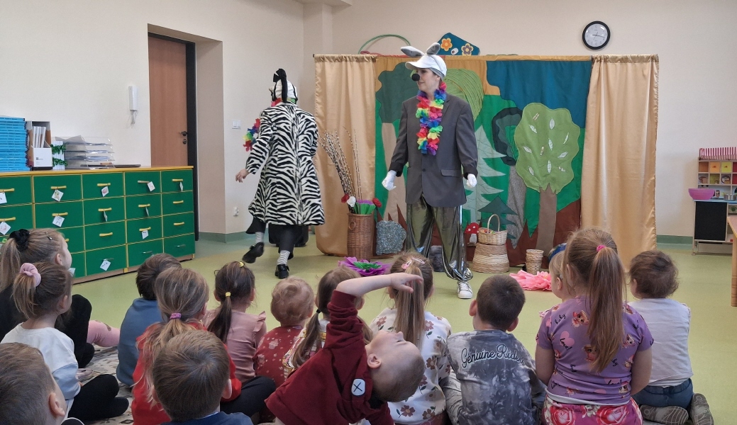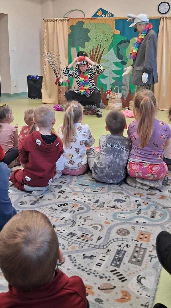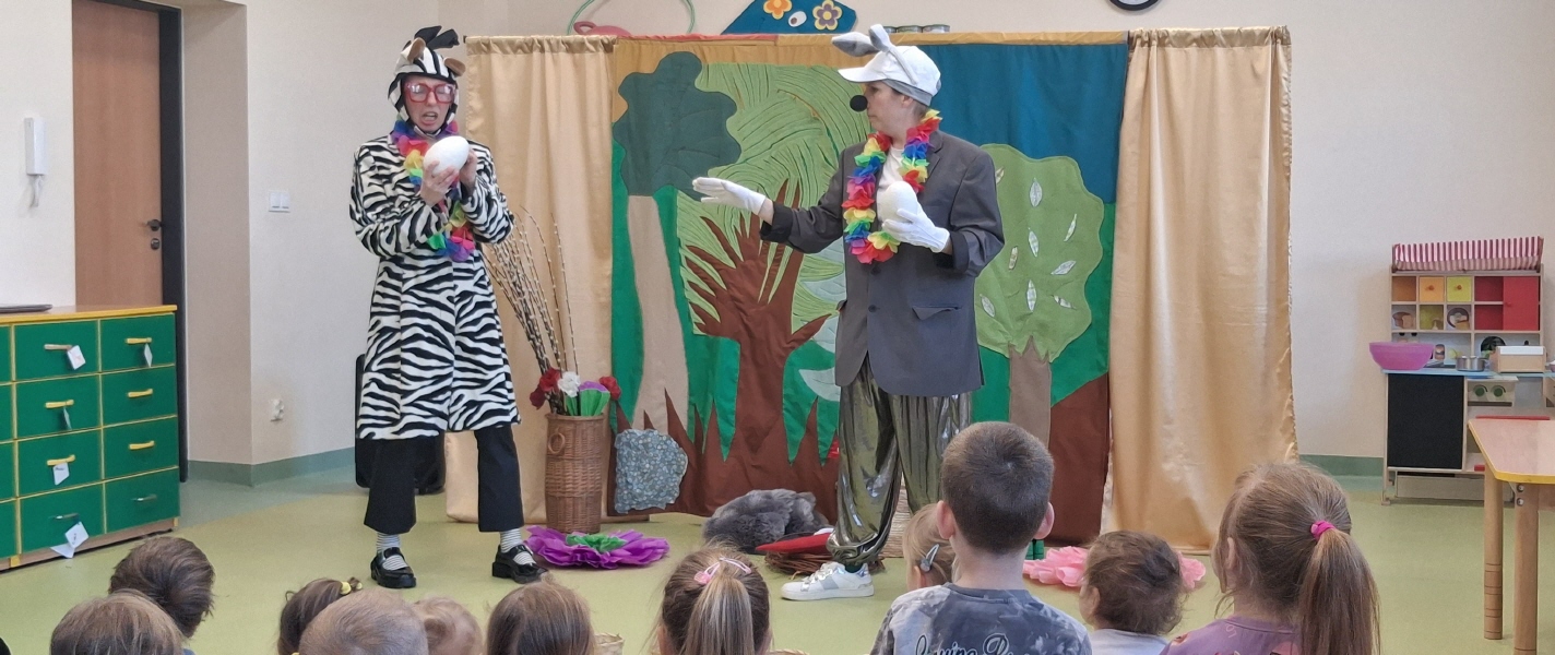 W oddziałach przedszkolnych naszej szkoły odbyło się wyjątkowe wydarzenie – dzieci miały okazję obejrzeć teatrzyk Pompon pt. „Zając w paski”. Spektakl został zaprezentowany w ramach projektu Gostyńska Kuźnia Talentów. Przedstawienie wzbudziło wśród najmłodszych ogromne zainteresowanie i wywołało wiele radości. Kolorowa scenografia, ciekawe postacie oraz pełna humoru historia sprawiły, że dzieci z dużym zaangażowaniem śledziły losy bohaterów. Była to nie tylko świetna zabawa, ale także okazja do rozwijania wyobraźni i wrażliwości na sztukę teatralną. Udział w spektaklu był również elementem rozwijania inteligencji interpersonalnej – dzieci uczyły się rozumienia emocji bohaterów, współodczuwania, budowania relacji oraz właściwego reagowania w różnych sytuacjach społecznych.